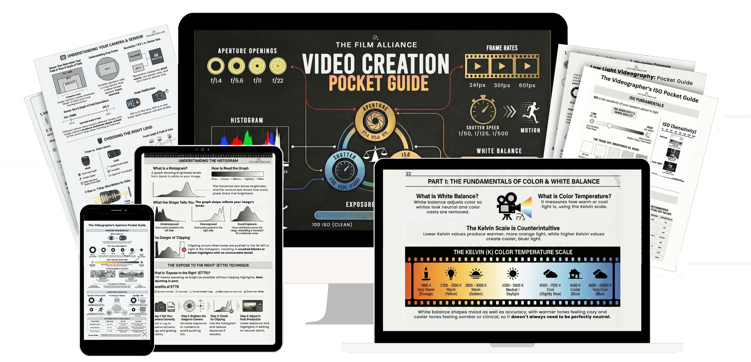 Each guide works as a visual reference, covering the concepts you’ll actually use in the field, from lenses and exposure to composition, white balance, and low-light shooting.