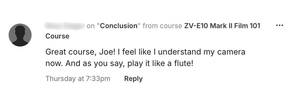 "I like this course because it not only teaches me what I need to know about the Sony ZV-E10 Mark II, but it also takes away the fear I felt when having to operate a camera. This anxiety that camera operation is some kind of witchcraft I will never be able to master used to hold me back. Therefore, I highly recommend getting both the 101 and 202 courses because they give you the confidence you need and, most importantly, the knowledge to prepare for shoots, which is essential for producing high-quality content."